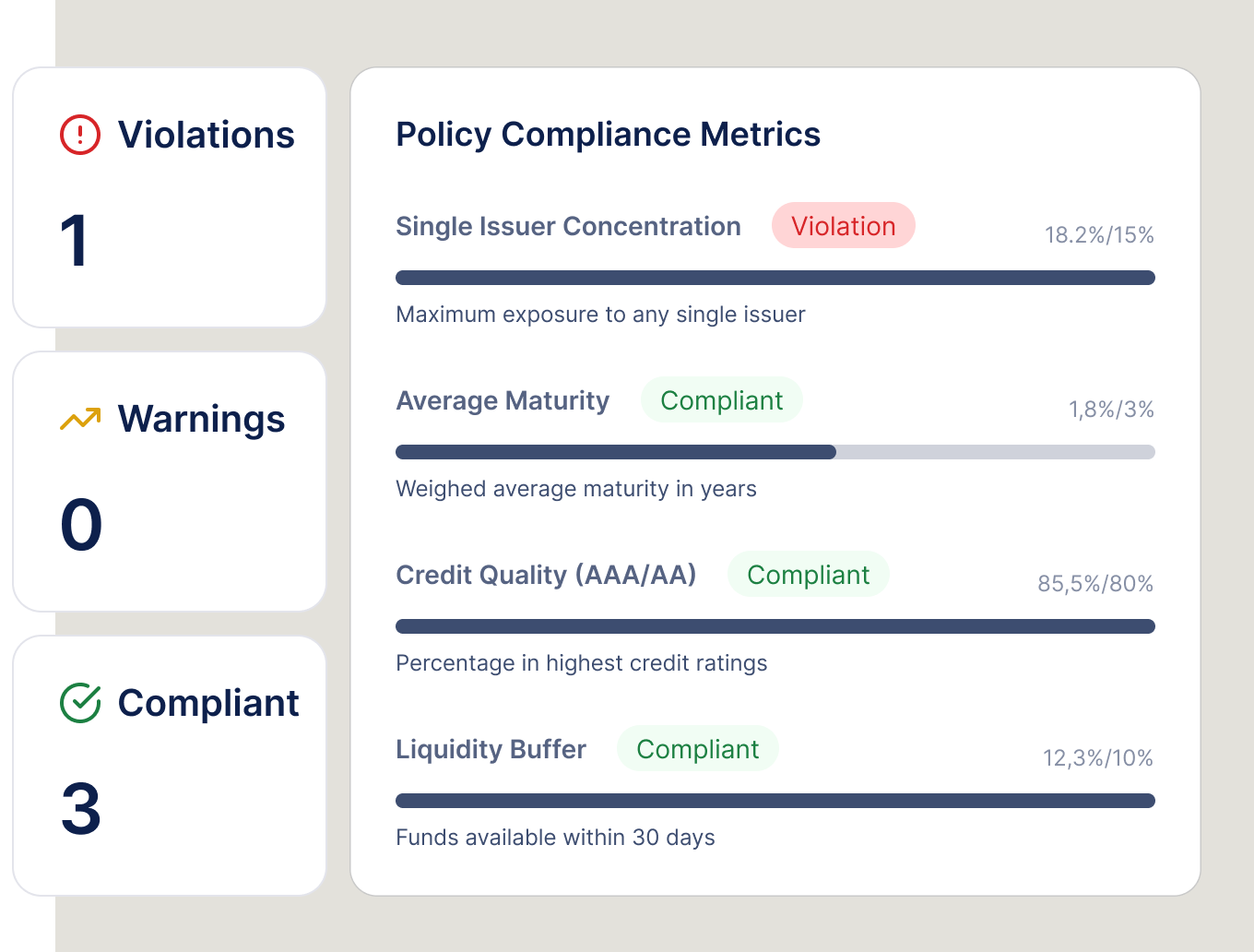 Never guess if you’re in compliance with state statutes or local policy. Get immediate alerts if concentration limits are exceeded or if a security falls out of policy.