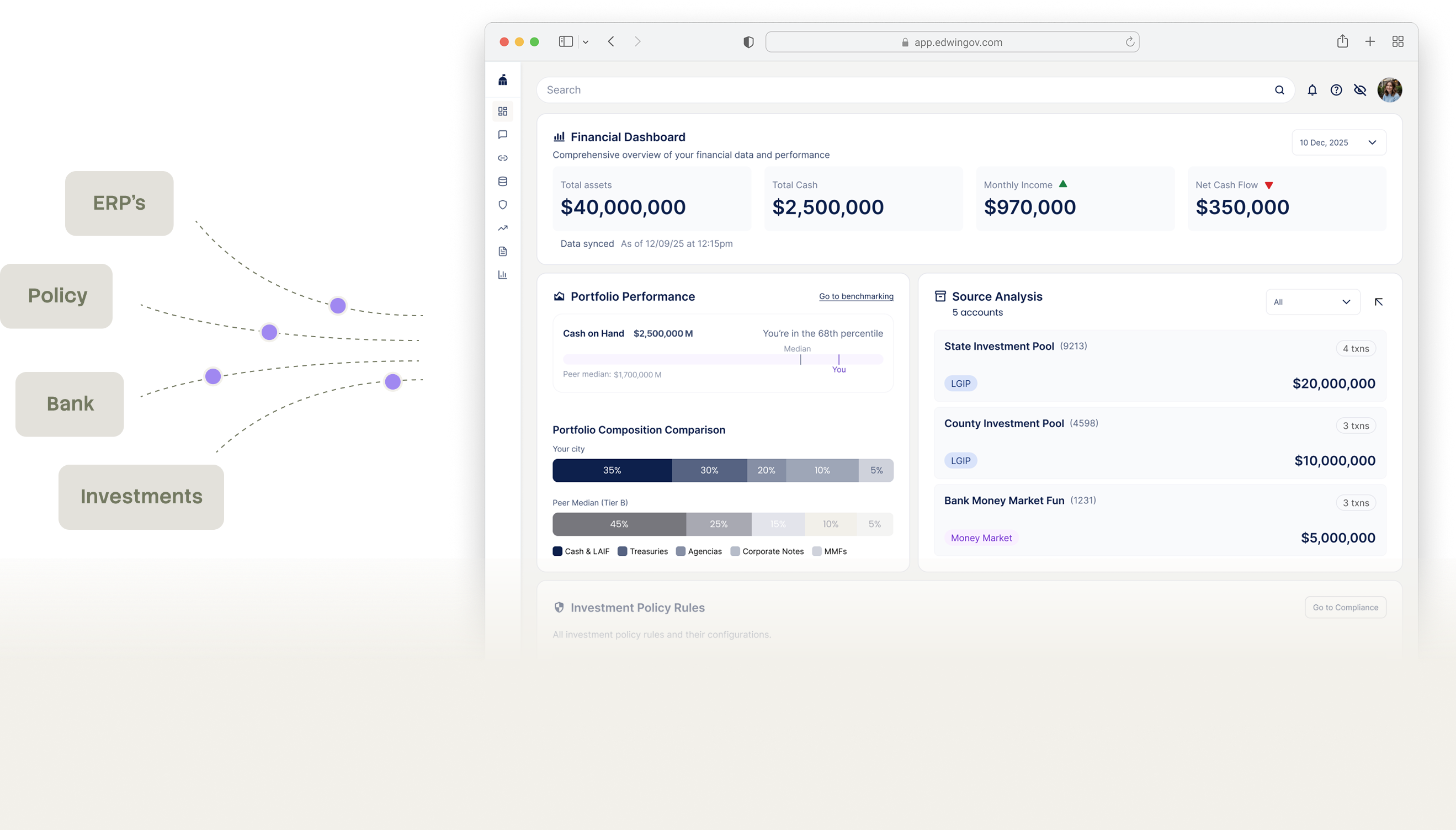 Gain the context you’ve been missing. Compare your portfolio’s yield, risk, and allocation against peer agencies of similar size and use data-driven comparisons to justify investment decisions to Council or Treasury boards.